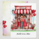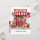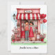 Personalize seu Vale para ele ou ela neste doce cartão de felicitações plano impresso com um casal adorável e sua cena peculiar de lojinha cheia de pequenos corações, balões e detalhes de flores. Edite seus nomes, monogramas e outros textos na frente e no verso. A ilustração em estilo aquarela tem um fundo pastel abstrato na frente e no verso. Criado em uma paleta de cores principalmente vermelhas e rosadas, com sua escolha de tamanhos.