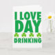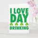 This card features the phrase “I LOVE DAY DRINKING” in large, all-caps sans-serif letters, stacked across three lines for a confident, flirty wink between friends 💚. “I LOVE” sits at the top in emerald green, like an opener that sets the tone without taking up too much space. The word “DAY” is centered and much larger, anchoring the design the way someone might lean in closer to make a point. Between “DAY” and “DRINKING,” four small shamrocks form a neat horizontal row, adding a cheerful St. Patrick’s Day nod ☘️. “DRINKING” runs along the bottom in the same emerald green, stretching wide and steady to finish the message. Everything sits on a bright white background with lots of open space, keeping the focus on the words and the shamrocks. The shamrocks are a light lime green, evenly spaced in a straight line beneath “DAY.”