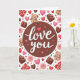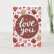 This greeting card features the words “love you” in white lettering centered inside a rich earthy brown circle, making the message feel close and intimate ❤️. Around it, a bright white background is sprinkled with smiling teddy bears whose gentle faces suggest cozy hugs and easy affection 🥰. Hearts in deep red, soft pink, and chocolate brown drift across the space, creating a romantic pattern without feeling crowded. A red gift box with a neatly tied ribbon sits among the icons, like a small surprise waiting to be opened. Nearby, little chocolate treats add a sweet, date-night touch alongside the softer symbols. Pink roses unfurl with delicate petals, balancing the simple shapes of the hearts and candies. The text stays centered while the surrounding illustrations are scattered evenly around it in a light, airy layout. The roses appear in pale to medium pink tones with subtle shading, and the gift’s ribbon curves in smooth loops against the white background.