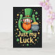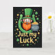 This card features a cheerful leprechaun centered on a deep black background, smiling with rosy cheeks and a fiery orange beard that feels inviting, like he’s sharing a private joke with you 💚. He wears a tall emerald-green top hat with a golden buckle, and his bright face stands out sharply against the dark setting. A large green horseshoe curves around him, framing him like a friendly hug and giving the scene a cozy, close-knit feel. Off to the right sits a pot brimming with gold coins, and a few coins spill outward as if someone just nudged it with a grin ☘️. Small shamrocks and scattered coins float around the leprechaun, adding little sparks of green and gold across the space. Near the bottom, the phrase “Just my Luck” appears in warm yellow, set in thick, raised-looking letters that pop against the black. The horseshoe shines in green with light catching along its edges, while the coins glint in tiny highlights around the pot and across the background.