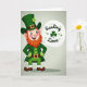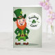 This greeting card features a friendly leprechaun standing front and center with his hands on his hips, wearing a deep emerald top hat and jacket with lighter green trousers and gloves. His rosy cheeks, twinkling blue eyes, and fiery orange beard frame a wide smile that feels like it’s meant for someone special 💚. Gold buttons and buckles catch the light across his outfit, adding a touch of shine without stealing focus from his warm expression. A neat shamrock sits on his tall hat, tying the look to St. Patrick’s Day ☘️. To his right, a white speech bubble floats at about head height, as if he’s leaning in to share a sweet note with a close friend. Inside the bubble, the words “Sending Love” appear in dark green lettering, with small shamrocks sprinkled around in a few green tones. The background stays a soft pale greenish-gray gradient, and the speech bubble has crisp edges with a few tiny shamrock accents nearby.