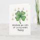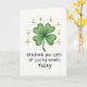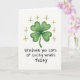 This card features a hand-painted four-leaf clover in emerald and lime green 💚, with four heart-shaped leaves that look softly translucent like watercolor. The clover sits in the upper half of the white background, and a slim stem drops downward as if gently reaching toward the viewer. Around it, eight irregular cross-like brushstrokes in warm rustic gold hover like little sparks, giving the scene a friendly, affectionate glow ☘️. The greens and golds stand out crisply against the white space, keeping the focus on the clover’s tender heart-leaf shape. Centered below the artwork, the message “SENDING YOU LOTS OF LUCKY WISHES TODAY.” appears in hand-drawn black lettering, slightly uneven in a way that feels like a note from someone close. The text is stacked in neat lines, with the final period adding a small, calm finish under the phrase. The gold marks form a loose ring around the clover, spaced unevenly so the circle feels airy rather than strict.