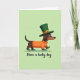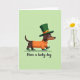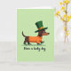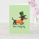 This card shows a dark brown dachshund in profile, striding across a pale lime-green background with an easy, friendly confidence 💚. The dog wears a bright orange knit sweater that stands out against its fur, and its wide, curious eye gives it a sweet, approachable look, like it’s heading toward a familiar face. On its head sits an emerald green leprechaun hat with a gold buckle and an orange band, bringing in a classic St. Patrick’s Day touch ☘️. Matching green sneakers with white laces add a funny, almost human step, and the lifted paw suggests a jaunty walk. The pup is centered in the layout, with a soft shadow under its feet to keep it grounded on the simple backdrop. Under the illustration, the phrase “Have a lucky day” appears in black lettering, placed low and centered so the dog remains the main focus. The background stays pale and uncluttered, letting the orange sweater, green hat, and green shoes pop against the light field.