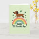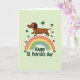 This card shows a glossy brown dachshund outlined in black, leaping with a little grin as if it’s bounding toward someone it adores. A softly colored rainbow 🌈 arches beneath it in gentle pastel bands, giving the pup a sweet “meet-me-here” stage for a friendly or romantic hello. Deep green three-leaf shamrocks ☘️ drift around the scene like scattered confetti, filling the space without crowding the main figure. The background is a smooth lime-green wash that keeps everything bright and springlike, with no heavy shadows. The dog’s wide eyes and lifted paw suggest an eager, affectionate greeting, like it’s reaching out to a close friend. Centered near the bottom, the phrase “Happy St. Patrick’s day” appears in deep green lettering that stands out clearly against the light backdrop. The rainbow’s soft pinks and blues sit just above the text, while shamrocks float across the top and sides around the jumping dachshund.