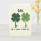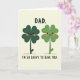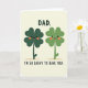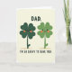 Designed with two anthropomorphic four-leaf clovers standing close together on a creamy off-white background, this St. Patrick’s Day card sets a sweet, friendly tone 💚. The clover on the left is a deeper emerald green, while the one on the right is a lighter lime green, and their colors softly contrast as they lean toward each other. Each has small black dot eyes, an open smiling mouth with a touch of pink, and warm orange blush on their cheeks that makes them look a little shy and affectionate ☘️. A thin sandy-colored ground line runs beneath them, giving the pair a simple place to stand. At the top, the word “DAD.” appears in dark lettering, centered and easy to read. Below the clovers, the message “I’M SO LUCKY TO HAVE YOU.” sits in the same dark text, spaced neatly across the lower area. The clovers’ rounded leaves, rosy cheeks, and the pale background keep the focus on their cozy closeness for sharing St. Patrick’s Day sentiments.
