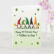 On the front of the card five gnomes stand shoulder to shoulder on a slim green strip, their fluffy white beards brushing the ground as they lean slightly toward one another like close friends. Their tall cone hats alternate through red, several greens, black, and orange, each dotted with small white spots or curled patterns that repeat across the row. A pale green background fades lighter toward the top, giving the scene a soft glow behind the figures. Darker green shamrocks float around them, framing the group with little bursts of ☘️. On the far left, one gnome lifts a golden mug as if toasting the others, while the far-right gnome cradles a tiny pot of gold with green and yellow balloons rising above it 🌈. Centered beneath the gnomes, the message “Happy St. Patrick’s Day! * Father in Law *” appears in green lettering. The hats’ white dots and the scattered shamrocks echo each other across the pale green gradient backdrop.