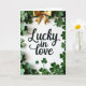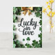 This card shows the phrase “Lucky in love” centered on a bright white background, written in a dark, flowing font that feels like a quiet promise between close partners. Around the edges, a border of shamrocks and four-leaf clovers wraps the message in layers of green, from pale sage to deep forest, like a shared walk through fresh spring leaves 💚. The clovers vary in size and overlap slightly, creating gentle depth and the sense that each leaf was placed with care, the way someone might fuss over a small gift for a friend. The layout keeps the words in the middle while the greenery draws your eye around the frame, giving the message room to breathe without feeling empty. At the top center sits a golden satin bow, its soft shine catching the light like a finishing touch on a present meant for someone special ☘️. The text stays crisp against the white space, while the green border forms a lively ring that guides attention back to the center. The bow’s loops and tails are neatly arranged, with smooth folds and a warm metallic glow above the clover frame.