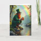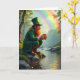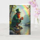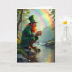 This card shows a leprechaun in an emerald green suit and tall top hat, his fiery orange beard catching the soft light as he crouches at the mossy edge of a quiet stream. He holds a frothy pint of amber ale close to his chest, like he’s saving it for a calm toast with a dear friend 💚. His sturdy brown boots rest on dark earth and scattered leaves, grounding him in the lush green setting. He looks toward the horizon with a gentle, faraway focus, as if sharing a private, tender thought with someone just out of view. A rainbow ☘️ curves across a sun-dappled sky, its colors lightly reflected in the water where small ripples travel outward. The background trees fade into a light haze, and the greenery around the bank feels thick and sheltered. “Happy St. Patrick’s Day” sits near the top in white lettering, while a smaller line in pale gold rests along the bottom edge, framed by the rainbow arching above and the stream shining below.