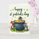 This card shows a dark cauldron overflowing with shiny gold coins, like a treasure find at the end of a rainbow 🌈. Three little mice gather close around it, creating a sweet, friendly scene that feels like they’re sharing a secret discovery together. In the middle, a grey mouse wearing a green leprechaun hat leans into the pile, its bright eyes fixed on the coins as if it can’t believe its luck 💚. On the left, a brown mouse rests its paws on the rim and looks across toward the others, as though checking that everyone gets a turn, with a four-leaf clover tucked near its feet ☘️. On the right, another grey mouse holds a small shamrock and tilts its head upward with a warm grin, its pink ears and nose adding a gentle touch of color. The mice stand on a rounded patch of green ground with a few scattered coins around their feet, suggesting the pot has been spilling over. Across the top, the words “happy st. patrick’s day” appear in green lettering, with small shamrocks floating nearby on a light cream background.