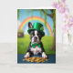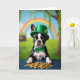 This card features a Boston Terrier puppy with an earnest, affectionate gaze, dressed in an emerald-green top hat with a shamrock and a matching bow tie 💚. Its black-and-white coat stands out against the festive greens, and the little dog’s posture feels like it’s leaning in close, as if sharing a private moment with whoever’s holding the card. The puppy’s paws rest on a scatter of shiny gold coins, and the red-painted nails add a cheeky, flirty touch to the scene. In the background, a soft-focus green landscape stretches under a calm blue sky, setting a gentle, romantic mood without needing any extra fuss. A rainbow curves across the distance 🌈, guiding the eye through the scene like a path toward a lucky find. The St. Patrick’s Day greeting appears near the top in green lettering, standing out clearly against the lighter sky area. Off to the left, a dark pot sits slightly blurred near the edge of the landscape, with the rainbow arching above it.