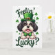 This card shows a cute cartoon puppy, like a little Shih Tzu, facing forward with big amber-brown eyes that seem to lock onto yours in a friendly, flirty way 💚. Its small paws rest over a simple ledge, as if it’s leaning in for attention, with a tiny pink tongue peeking out. A tall emerald leprechaun hat with a shiny gold buckle sits on its head, and an oversized green bow tie adds a dressed-up, date-night feel. The background is bright white, making the greens stand out, while scattered shamrocks float around the edges for a festive touch ☘️. At the top, the word “Feelin’” appears in emerald-green lettering, centered above the puppy’s head. Below the ledge, “Lucky?” is also centered in matching green, balancing the layout and framing the pup’s face. Around the outer area, small green shamrocks are spaced like confetti against the white space.