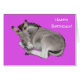 Um filhote de burro de cinza giro deitado sobre um fundo roxo. O texto diz 'Parabéns!' na frente e dentro: "Que todos os seus desejos de aniversário sejam burros!". Todo texto pode ser alterado para palavras de sua escolha.