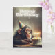 Um macaco olha maravilhosamente para o seu bolo de aniversário com velas.