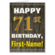 Este simples design de cartão de saudação com tema de aniversário apresenta um desejo de aniversário quente como "HAPPY 71rua BIRTHDAY, First-Name!" na frente, em texto em negrito sobre um fundo de padrão de aparência de madeira falsa. O número de aniversário tem uma aparência falsa e imitada de cor dourada. O nome na frente pode ser personalizado. O dentro apresenta uma mensagem de aniversário que pode ser personalizada. Um cartão de boas-vindas como este poderia ser uma maneira divertida de fazer votos de aniversário a alguém que comemora seus setenta anos. [~Z0000280]