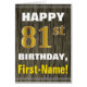 Este simples design de cartão de saudação com tema de aniversário apresenta um desejo de aniversário quente como "HAPPY 81rua BIRTHDAY, First-Name!" na frente, em texto em negrito sobre um fundo de padrão de aparência de madeira falsa. O número de aniversário tem uma aparência falsa e imitada de cor dourada. O nome na frente pode ser personalizado. O dentro apresenta uma mensagem de aniversário que pode ser personalizada. Um cartão de boas-vindas como este pode ser uma maneira divertida de fazer votos de aniversário a alguém que comemora o seu oitenta aniversário. [~Z0000280]