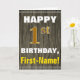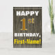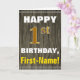 Este simples design de cartão de saudação com tema de aniversário apresenta um desejo de aniversário quente como "primeiro aniversario FELIZ, Nome Próprio!" na frente, em texto em negrito sobre um padrão de aparência de madeira falsa. O número de aniversário tem uma aparência falsa e imitada de cor dourada. O nome na frente pode ser personalizado. O dentro apresenta uma mensagem de aniversário personalizável. Um cartão de boas-vindas como este poderia ser uma maneira divertida de fazer votos de aniversário a alguém que comemora seu primeiro aniversário. [~Z0000280]