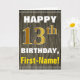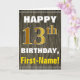 Este simples design de cartão de saudação com tema de aniversário apresenta um desejo de aniversário quente como "FELIZ 13 BIRTHDAY, First-Name!" na frente, em texto em negrito sobre um fundo falso de padrão de aparência de madeira. O número de aniversário tem uma aparência falsa e imitada de cor dourada. O nome na frente pode ser personalizado. O dentro apresenta uma mensagem de aniversário que pode ser personalizada. Uma carta de boas-vindas como esta poderia ser uma maneira divertida de fazer votos de aniversário a alguém que comemora o seu décimo terceiro aniversário. [~Z0000280]