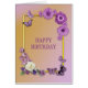 Um belo cartão de aniversário floral. Flores e borboletas em um quadro de ouro. Um tema lilático dá uma sensação relaxada mas luxuosa. Um cartão maravilhoso para dar a alguém que você se importa no seu aniversário.