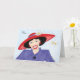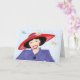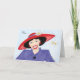 Dama de cabelo preto e batom vermelho vestindo um chapéu vermelho com uma margarida na borda.