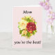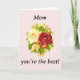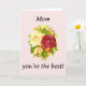 Celebre sua maravilhosa mãe com este cartão do Dia das Mães, lindamente desenhado. Com um elegante buquê de rosas e a mensagem sincera "Mãe, você é a melhor!", este cartão captura perfeitamente a sua gratidão e amor. A ilustração floral clássica adiciona um charme atemporal, tornando-o adequado para qualquer estilo. Ideal para presentear junto com flores ou como uma surpresa por si só, é uma maneira adorável de fazer com que sua mãe se sinta querida e especial. Impresso em papel de alta qualidade, este cartão foi projetado para deixar uma impressão duradoura. Perfeito para o Dia das Mães, aniversários ou simplesmente porque sim!