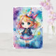 Uma ilustração vibrante da aquarela digital de uma menina de olhos largos com cabelo de cor arco-íris, vestindo uma roupa festiva e chapéus de partido pontilhados por polca. Ela segura balões e um pirulito enquanto fica em pé contra um fundo colorido pintado com tela plana cheio de tons brilhantes de roxo, azul, amarelo e rosa. A cena química irradia alegria e celebração.