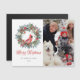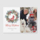 A foto da sua família está à direita. Uma clássica coroa de Natal com cardeal vermelho está à esquerda. A saudação de Natal está abaixo. Seu nome e o ano seguem.