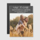 Um save the date moderno em um formato de cartão magnético único projetado para acomodar sua foto de noivado favorita. "Salvar a data" aparece no topo da sua foto em bloco branco e letra cursiva, com seus nomes, data do casamento e local do casamento abaixo em um fundo cinza. Use a linha adicional de texto para compartilhar seu site de casamento ou detalhes adicionais.