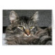 A cinza de Maine Coon cat mix face a face olha através deste cartão de saudação fotográfico, o queixo quase enterrado no seu rúff ou homem.