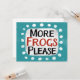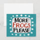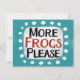"Mais Sapos, por favor" é um design de texto divertido com uma forma de sotaque branca cercado por pontos brancos texturizados.