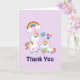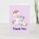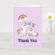 Cartão de agradecimento fofo com uma mamãe unicórnio branca com crina e cauda coloridas e elegantes. Um bebê unicórnio deitado ao lado dela, com uma chupeta verde na boca. Um arco-íris colorido com nuvens fofas, e algumas estrelas e coração decoram este design doce e adorável. Um contorno rosa ousado ao redor da imagem dá a ela uma vibe de desenho infantil. Fundo roxo claro.