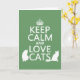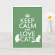 Este é o clássico poster de guerra "Manter Calmo e Continuar", reformulado para "Manter os Gatos Calmos e de Amor". Está escrito em branco sobre fundo colorido, e é acompanhado por silhuetas de gatos sentados perto das palavras. Disponíveis em uma grande variedade de produtos, incluindo cadernos de anotações, adesivos, botões, bolsas de livros e t-shirts, eles fazem presentes/presentes/guloseimas de excelentes para amantes e donos de gatos, ou obrigados que você oferece para veteranos e donos de lojas. Todas as cores de fundo são facilmente personalizadas para suas preferências.