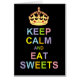 Mantenha calmo e coma o cartão dos doces. O cartão customizável bonito diz mantem a calma e come doces em letras coloridas com uma coroa em um fundo preto.