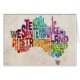 Um mapa de texto tipográfico da Austrália. O mapa é feito a partir dos nomes dos estados e territórios da Austrália, em estilo aquoso urbano.