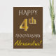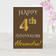 Este simples e personalizado design de cartão de felicitações de aniversário de casamento apresenta a mensagem "FELIZ 4º ANIVERSÁRIO", com o "4º" tendo uma aparência semelhante ao ouro. A frente também apresenta um nome personalizado e um fundo de cor castanha. O interior apresenta uma mensagem personalizada de felicitações de aniversário de casamento. Pode ser dado ao marido ou à esposa em celebração do quarto aniversário de casamento do casal.