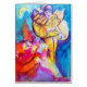 Músicos carnavalescos coloridos, brancos e artísticos à luz da lua, pintura aquosa com cores brilhantes em vermelho, cor rosa azul de fúcsia, cores amarelas. Caracteres inspirados no Commedia dell' Arte e Carnaval de Veneza e máscaras de penas venezianas.