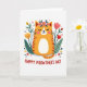 This card features a rounded orange cat with soft reddish-brown stripes, sitting calmly at the center with its eyes closed and a small, tender smile that feels like a quiet cuddle ❤️. A ring of small pink blossoms and green leaves rests on its head, giving it a sweet, cared-for look, like it’s been dressed up by a close friend. Around the cat, matching leafy shapes and simple flowers in yellow and coral-pink form a balanced frame, leaning inward as if they’re gathering to celebrate together. The white background keeps everything airy, letting the warm oranges and fresh greens stand out without looking busy. Near the bottom, a short message is placed beneath the illustration in red lettering, easy to spot against the white space. The overall scene suggests closeness through gentle curves, soft expressions, and the way the flowers seem to cradle the cat in a friendly embrace 🌼. Small decorative leaf and bloom details are scattered evenly around the main figure, with tulip-like shapes and rounded petals repeating in a tidy pattern. The text sits centered below the cat in solid red, while the surrounding flowers alternate yellow and coral-pink beside deep green leaves.