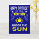 Feliz aniversário para o melhor filho sob o sol, lê a parte de fora deste cartão de cumprimentos fofo, bem projetado. O dentro completa o pensamento poético com as palavras "bar nenhum". Qualquer mãe ou pai teria orgulho de acrescentar à festa de aniversário do filho, ao janto de aniversário ou a qualquer outra forma de celebração com esta expressão. O bolo de aniversário também terá um sabor muito mais doce.