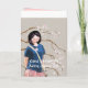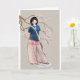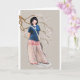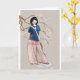Menina em calças de harém e galho de flores de cereja faz um cartão de aniversário adorável ou um cartão de saudação de ocasião. Alterar as palavras para se adequar