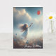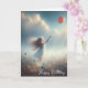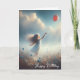 Uma jovem de cabelo comprido se agarra a um balão vermelho em um campo sujo cheio de flores silvestres coloridas para um aniversário. O texto pode ser alterado.