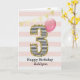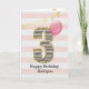 Um cartão de aniversário de 3 anos rosa e dourado para menina, que você pode personalizar com o nome dela. A frente deste lindo cartão de aniversário de 3 anos para ela apresenta o número três em uma faixa preta e branca com um contorno brilhante e um balão rosa pronto para flutuar. Observe que o brilho dourado é um efeito de design e não haverá brilho real neste cartão de aniversário. O fundo é branco macio e rosa com uma faixa de bandeirolas douradas no topo. A mensagem interna pode ser facilmente personalizada se desejar. Um lindo cartão de aniversário de 3 anos para ela.