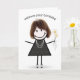 Menina de palito fofa com cabelo, tênis, vestido de bolinhas, colar de pérolas e buquê de margaridas.