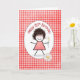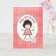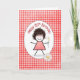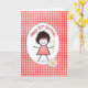 Linda menina de palito com cabelo, óculos vermelhos, vestido xadrez e segurando margaridas em um padrão xadrez vermelho e branco para o aniversário de 85 anos.