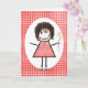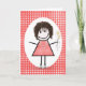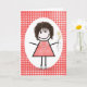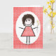 Menina de palito fofa com cabelo crespo, tênis, vestido xadrez, colar de pérolas e buquê de margaridas em fundo xadrez vermelho e branco.