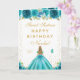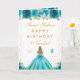 Este cartão de aniversário de sweet sixteen elegante e glamoroso pode ser personalizado com um nome ou título, como filha, neta, sobrinha, amiga, etc. O design apresenta uma bela princesa com cabelos loiros e pele clara em um vestido de baile azul-teal. O texto combina caligrafia manuscrita e fontes modernas sem serifa para um visual sofisticado e elegante. Os arranjos florais, borboletas e confetes dourados criam a combinação perfeita de rústico e chique.