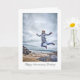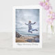 Um cartão de cumprimentos com uma mulher pulando de alegria de cima de algumas rochas na praia. Seus braços e pernas estão parcialmente estendidos, transformando-o em um salto de caranguejo. Ela está usando um casaco acolchoado contra o frio e seus cabelos estão levantados pelo vento. Com uma expressão feliz e olhos arregalados, a impressão geral é de exuberância selvagem.