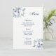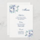 Cartão de Menu mostrado em papel básico em branco com um adorável impressão floral azul. Script e texto padrão em azul. Personalize os itens de menu clicando no botão personalizar, procure à direita e encontre as caixas apropriadas para alterar suas informações. Imagem do stock freepik.com