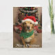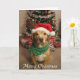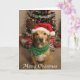 This holiday card shows a golden dog wearing a red Santa hat and reindeer antlers with jingle bells, and a green bandana with snowflakes. The dog is in the middle, looking cute and patient. In the background, there's a Christmas tree with red, green, and gold lights, silver tinsel, and ornaments. There are wrapped presents under the tree, all colorful and festive. The card says "Merry Christmas" in fancy writing. It's a cozy and joyful scene, perfect for spreading holiday cheer. 🎅🏼🎄🎁