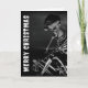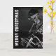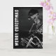 Merry Christmas text can be customized by you. Sad skeleton wearing a Santa hat, sitting on the floor. Black and white artwork.
