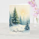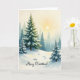 This beautiful watercolor painting shows a calm winter scene with lots of snow. 🎄 There is a big, green tree in the middle covered in white snow, with smaller trees beside it. The background has a misty forest with blue and gray colors, making the scene feel peaceful and huge. In the top right corner, there is a glowing circle that makes everything look warm and cozy. You can see small footprints in the snow, telling a sweet story of a journey. The words "Merry Christmas!" are written in a fancy way that fits perfectly with the magical feeling of the painting. 🎅🏼 This card is just right for spreading holiday happiness and joy!