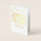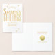 Este cartão de feriado empresarial empresarial de folha de ouro moderno apresenta um fundo branco com uma tipografia moderna em folha de ouro que lê "Feliz e Brilho, Saudações da Estação, De Todos Nós Em, o seu nome comercial." O guião dentro em ouro falso diz: "Desejos quentes por uma época de férias alegre e os Anos novos mais felizes!" Há também um lugar para o logotipo e assinatura da sua empresa, que podem ser personalizados. Projetado pelo artista © Tim Coffey.